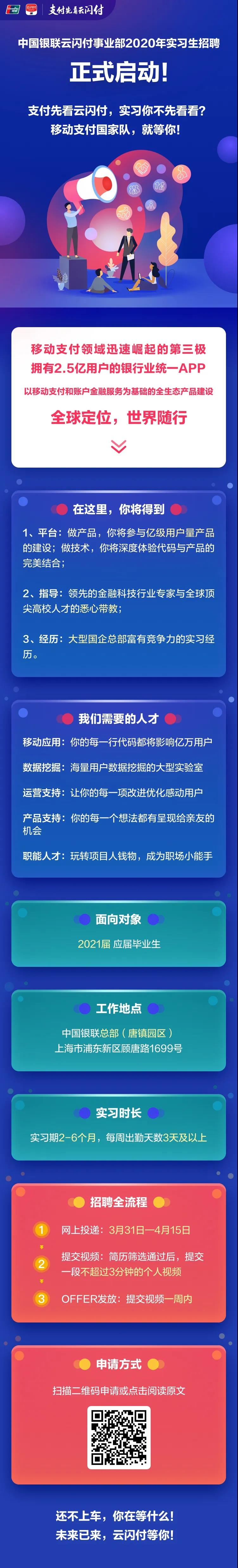 2020年中國銀聯(lián)云閃付事業(yè)部實習生招聘正式啟動公告