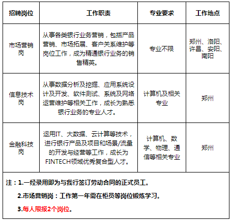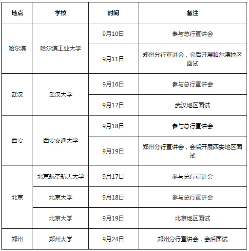請關注“招商銀行鄭州分行”,如有調整,將在公眾號及學校官網中另行通知。請參加宣講會及面試的同學提前準備兩份簡歷并提前進行網申投遞。對于校園招聘宣講會未覆蓋地區的省外高校學生,我行根據情況另行安排面試,具體安排以短信通知為準。