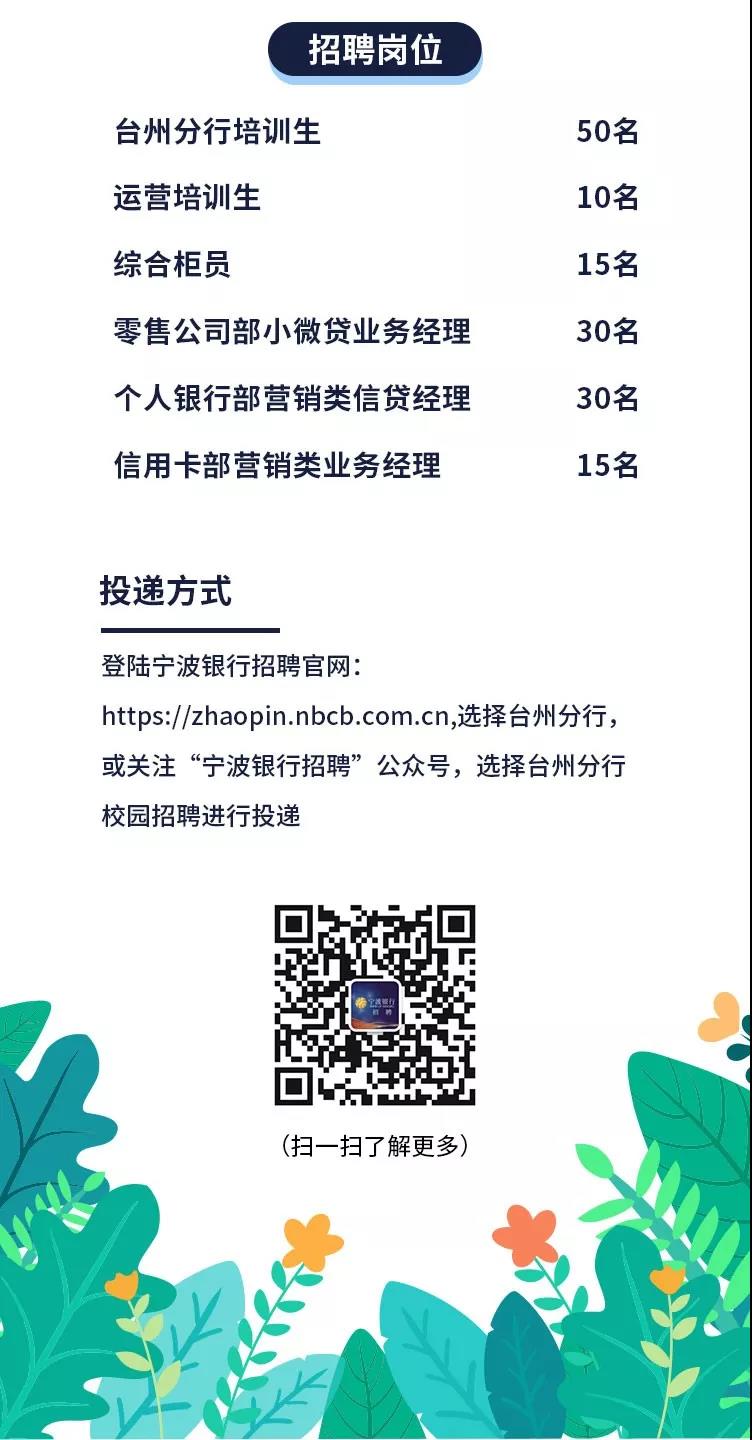 崗位職責以寧波銀行臺州分行為單位進行招聘的崗位。臺州分行培訓生是指我行通過校園招聘方式選拔的優秀畢業生,經過我行系統培訓后在分支行各業務條線從事營銷管理工作,旨在通過我行產品為客戶提供全方位、高品質的金融服務。