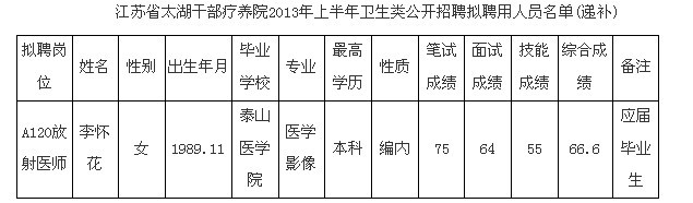 江蘇省太湖干部療養院2013年上半年衛生類招聘擬聘用人員(遞補)