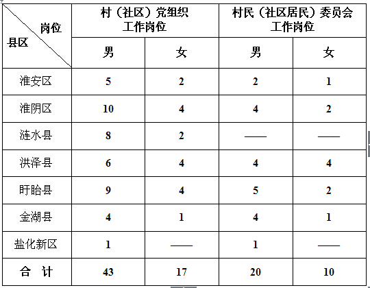 全市選聘到村(社區(qū))任職高校畢業(yè)生90名,其中淮安區(qū)10名、淮陰區(qū)20名、漣水縣10名、洪澤縣18名、盱眙縣20名、金湖縣10名,淮安鹽化新材料產(chǎn)業(yè)園區(qū)2名(以下簡(jiǎn)稱鹽化新區(qū)),具體崗位要求如下: