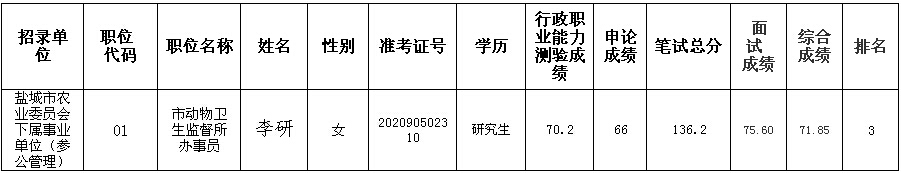 獲悉,2016年,鹽城市農(nóng)業(yè)委員會下屬參照管理事業(yè)單位01職位招錄2名參照管理工作人員,進入體檢環(huán)節(jié)的綜合成績第1名考生宋廣超自愿放棄體檢資格,并提交了書面材料。按照有關(guān)文件規(guī)定,鹽城市農(nóng)業(yè)委員會對該職位綜合成績第3名考生李研進行遞補,現(xiàn)予以公告。