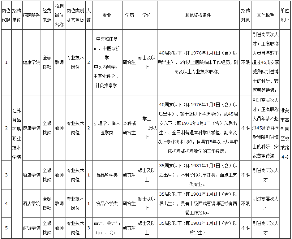 江蘇食品藥品職業技術學院2016年公開招聘教師崗位表(第二批)