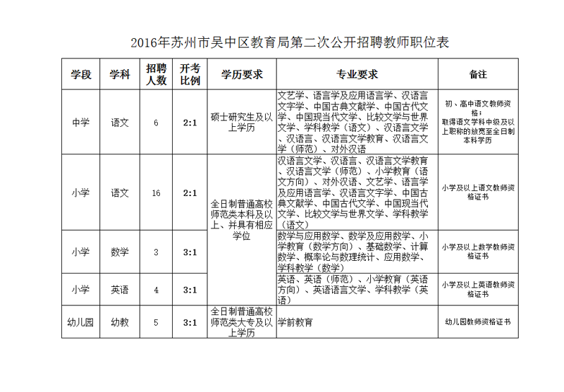 根據(jù)《事業(yè)單位公開招聘人員暫行規(guī)定》(人事部2005年6號(hào)令)、《江蘇省事業(yè)單位公開招聘工作人員辦法》(蘇辦發(fā)〔2011〕46號(hào))和《蘇州市事業(yè)單位公開招聘工作人員暫行辦法》(蘇辦發(fā)〔2011〕27號(hào))有關(guān)規(guī)定,蘇州市吳中區(qū)人力資源和社會(huì)保障局、蘇州市吳中區(qū)教育局第二次面向社會(huì)公開招聘中小學(xué)、幼兒園部分學(xué)科教師34名。現(xiàn)將《招聘簡(jiǎn)章》公布如下: