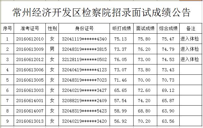 常州經濟開發區檢察院招錄面試成績公告